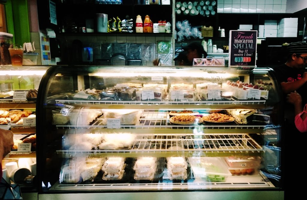ケーキやパイ等が並ぶ冷蔵ケース。